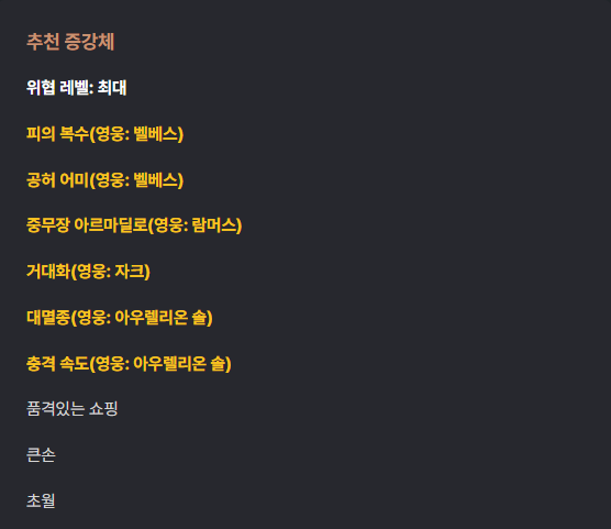 영웅 증강으로는 메인 캐리로 쓰이는 솔이나 벨베스의 유닛강화 증가가 아니라면, 람머스나 자크, 초가스 등의 증강체는 아군 강화형 영웅 증강을 추천드립니다.