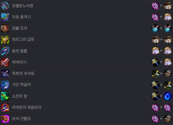 아우솔은 마나통이 크므로 쇼진의 창, 앞 라인에서 오래 버텨주므로 시간이 갈수록 강력해지는 대천사나 한 방 딜이 강력해지는 라바돈의 죽음모자, 스킬에 치명타가 터질 수 있는 보석건틀릿, 체력이 높은 적들에게 추가 피해가 가능한 거인학살자 등을 추천드립니다. 기본적으로 쇼진의 창 + 2 AP딜템으로 기억하신 후 유동적으로 주시면 좋을 듯 합니다. 참고로 아우솔의 스킬에는 치유감소효과가 자체적으로 붙어 있기에 모렐로의 효율이 좋은 편은 아닙니다.