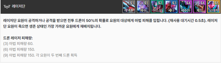 레이저단 시너지의 고유 능력은 어느정도 파괴력인지 가늠은 안가지만, 레이저단의 고밸류(4코,5코)의 성능이 너무 좋아서 시즌초에는 많은 사람들이 가지 않을까 싶습니다.(세주아니 - 광역CC, 제드 - 방어력감소, 모데카이저 - 마법저항력 감소)