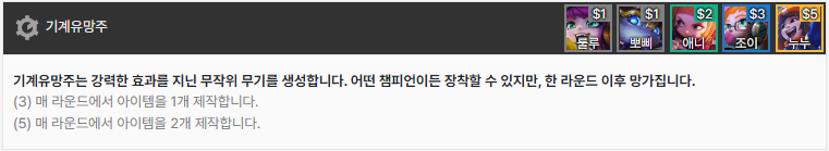 기계 유망주는 예전에 있었던 고물상 시너지를 약간 떠올리게 하네요. 3과 5 시너지가 있으며 3의 경우에는 무작위 무기 1개를, 5시너지의 경우에는 2개를 제작하며, 한 라운드에 1번만 사용할 수 있으며 한 라운드 이후 망가진다고 적혀있습니다. 크립이나 초반 상점에서 럭키 애니나 조이가 나온다면 초반에 3 기계 유망주로 아이템을 갖고 시작하므로 빌드업 단계에서 유용하게 사용할 수 있을거라 예상이 됩니다. 다만 후반에는 누누,조이 까지는 괜찮은데 애니가 2코스트여서 후반 밸류에서는 기계유망주는 크게 안쓰일듯 보이네요.